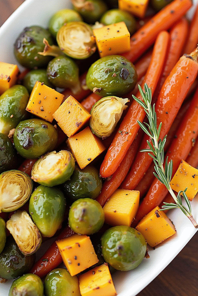 Transfer the roasted vegetables to a beautiful platter, garnish with chopped parsley, and maybe a scattering of toasted pecans or pumpkin seeds for added crunch. This recipe pairs excellently with turkey, stuffing, or even as a vegetarian main. Serve warm for best flavor and texture.