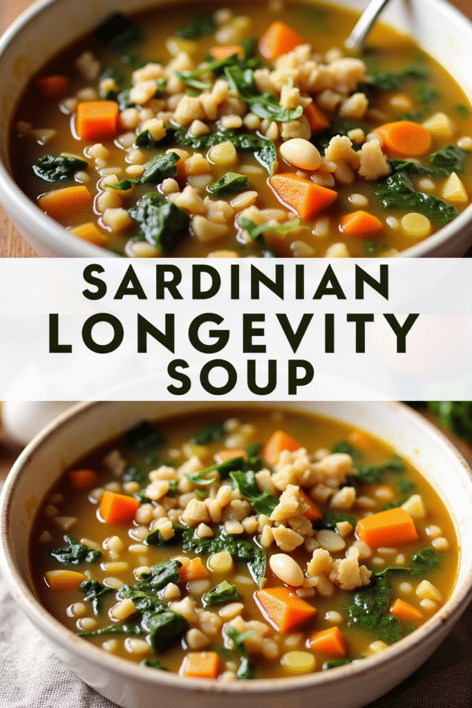 Serve your Sardinian Longevity Soup with a drizzle of extra virgin olive oil and a slice of rustic whole grain bread. A sprinkle of freshly chopped parsley or lemon zest just before serving brightens the flavors. This soup is a nutrient-rich, comforting main course perfect for lunch or dinner, and it stores beautifully for easy leftovers.