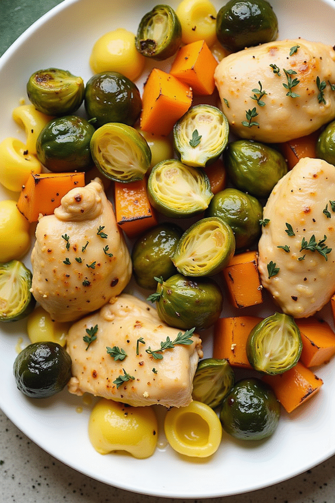 For this meal, the best results come from using bone-in, skin-on chicken thighs for optimum juiciness. Fresh Brussels sprouts and cubed sweet potatoes provide earthy depth, while crisp apple wedges add a subtle sweetness and contrast in texture. A drizzle of maple syrup and fresh herbs ties everything together, giving the dish its signature autumnal aroma and taste.